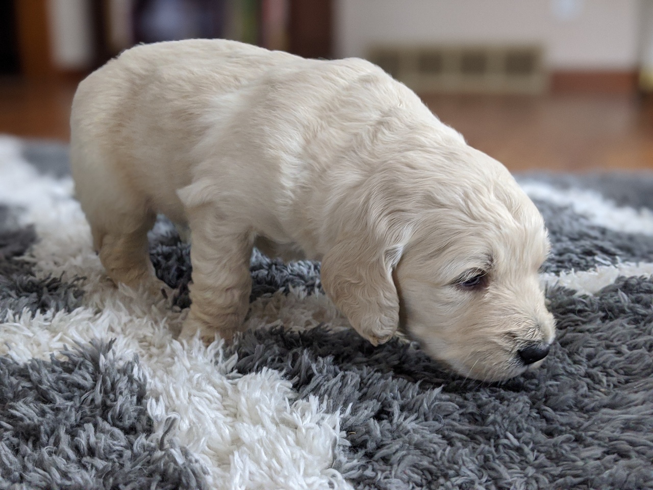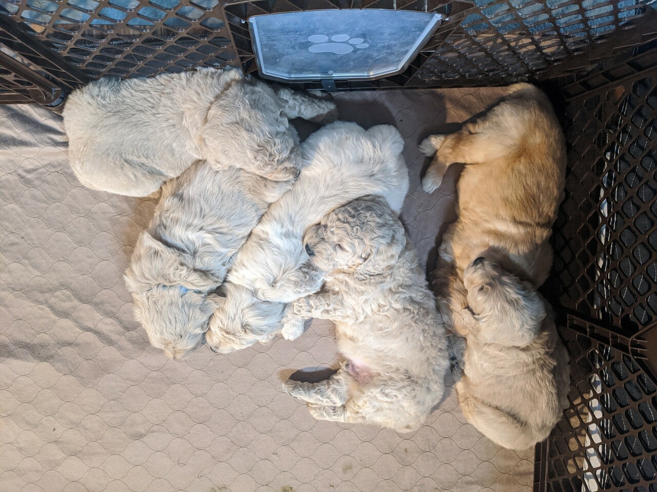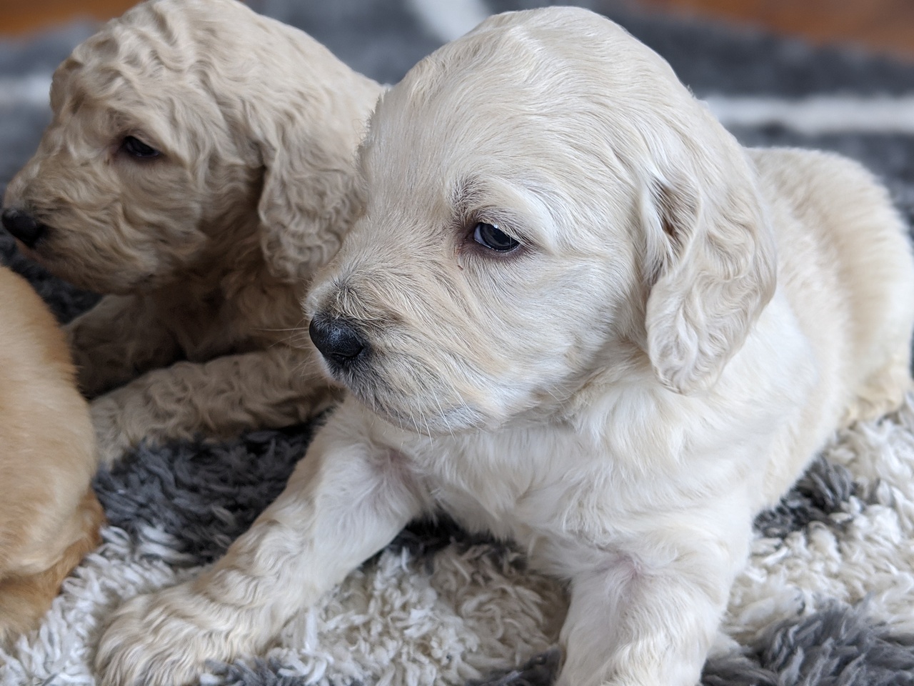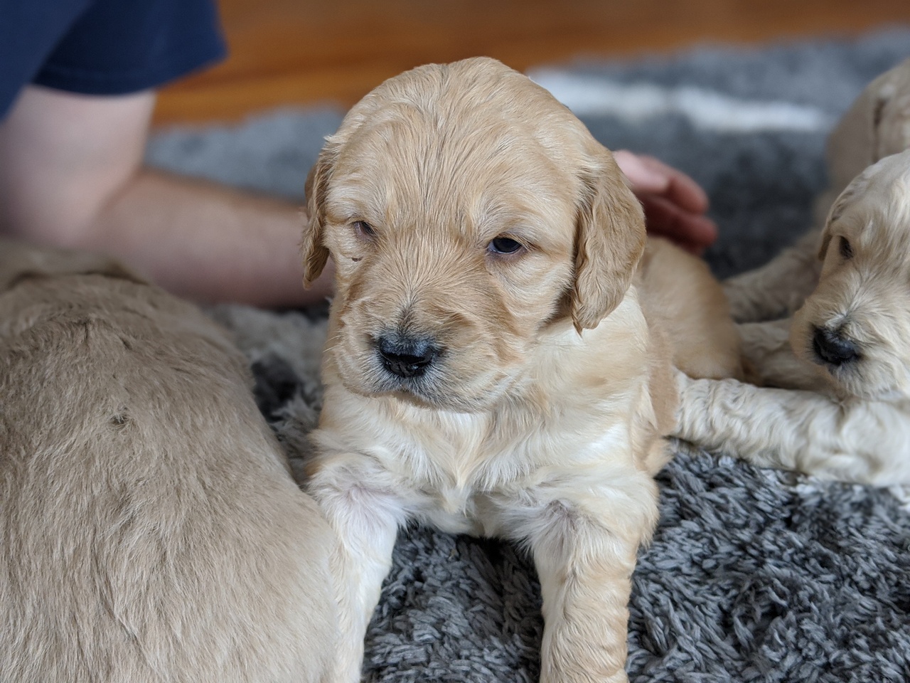 Update 2/21/2021: We have one puppy still available for adoption: a very sweet, curly male. Here’s a video of him in action. Feel free to reach out to us on the contact page for more information! We have puppies! Our English Cream Golden Retriever “Pyrrha” gave birth to a litter of six beautiful Golden Doodle puppies on January 6th, 2021! They’ve been growing like crazy ever since!