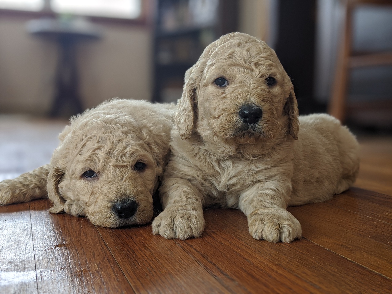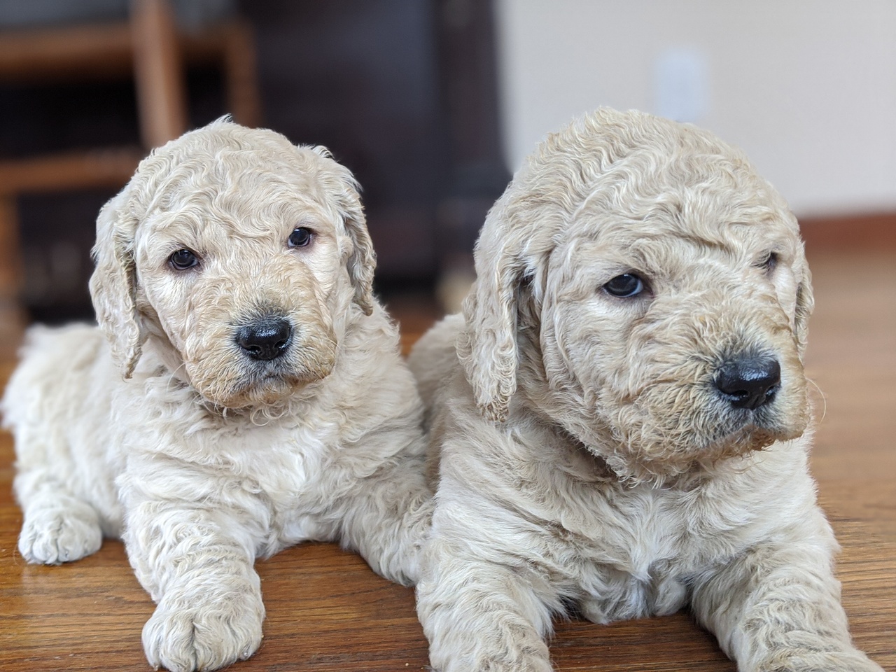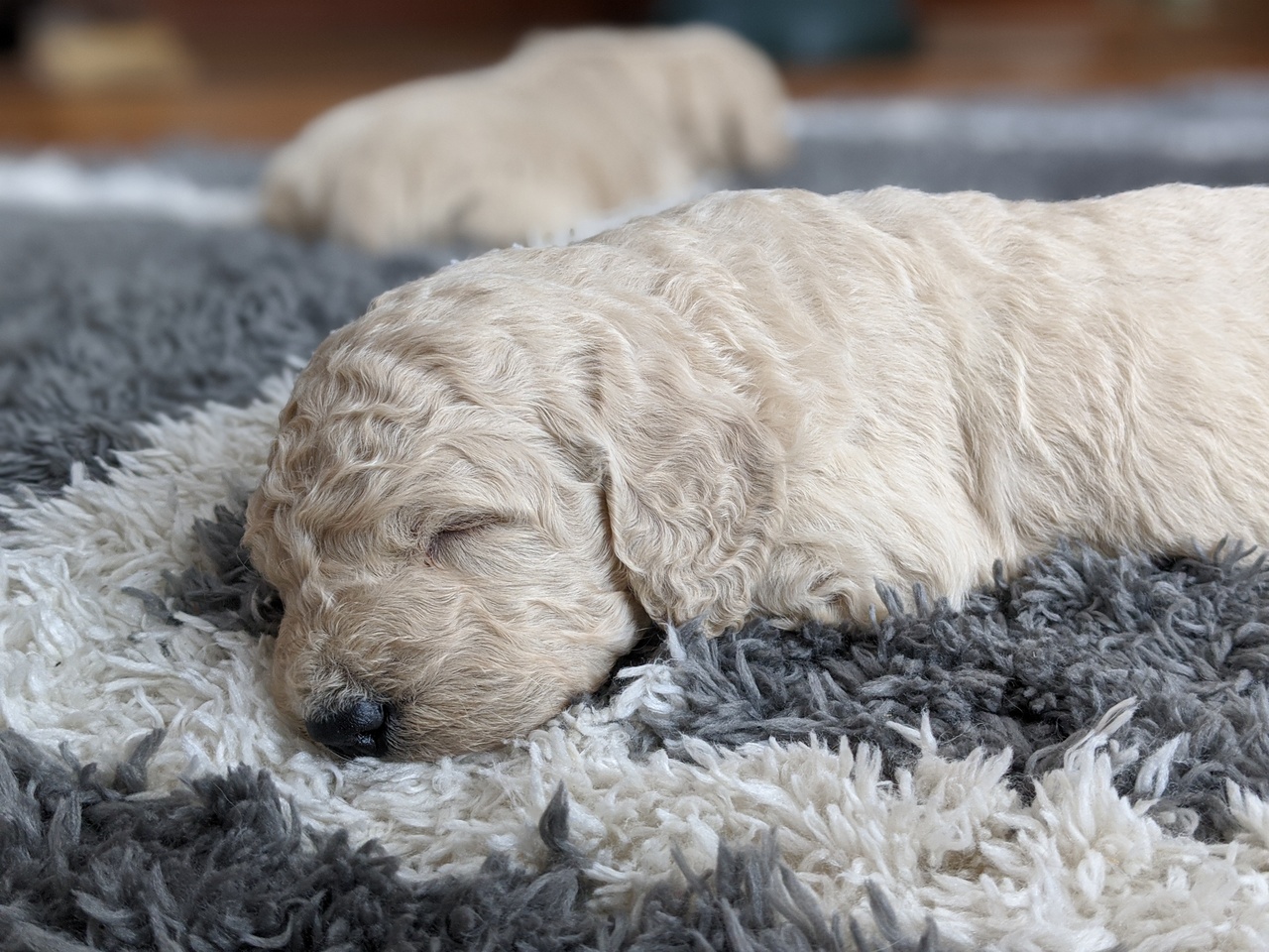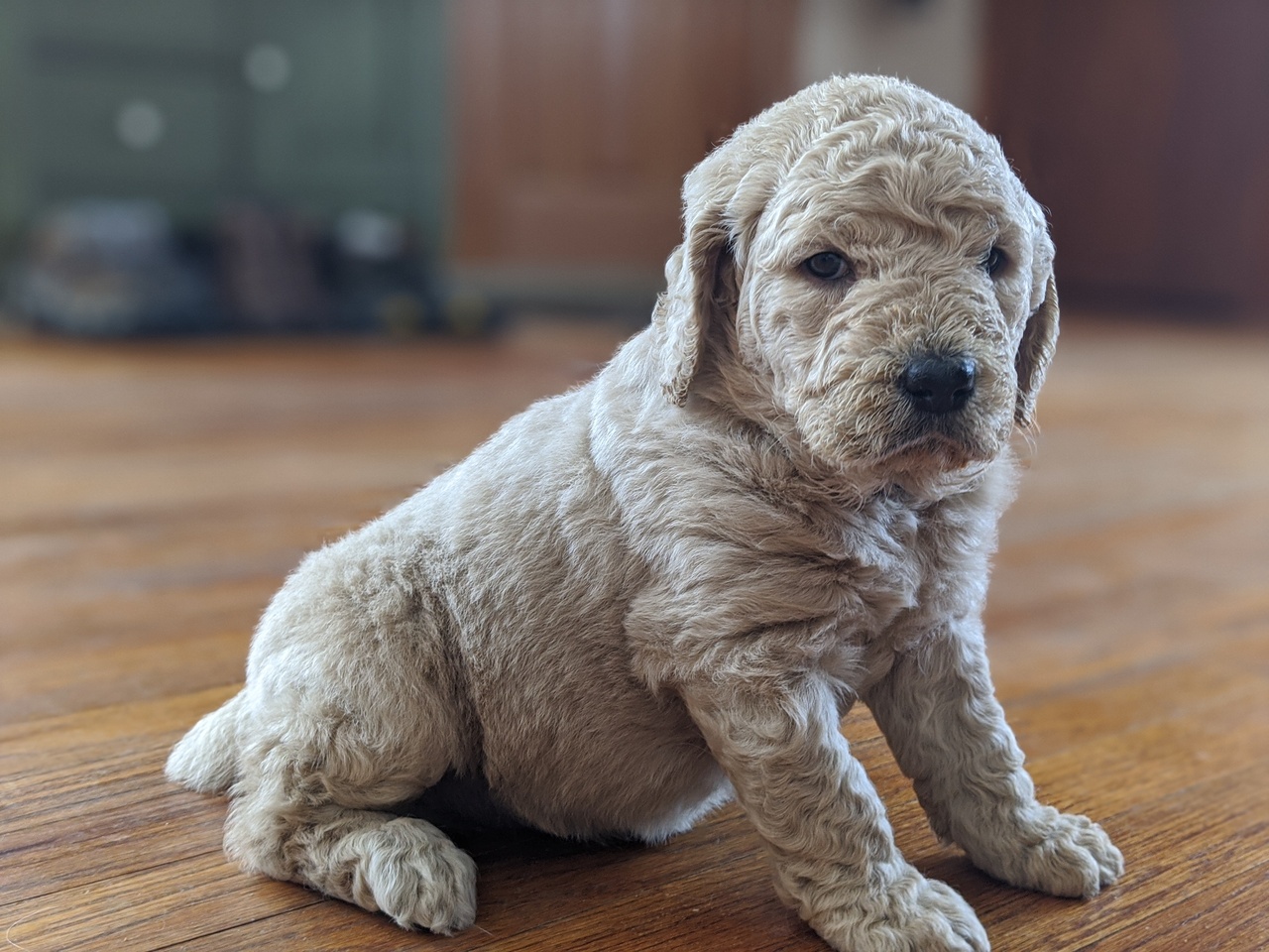 Update 2/21/2021: We have one puppy still available for adoption: a very sweet, curly male. Here’s a video of him in action. Feel free to reach out to us on the contact page for more information! We have puppies! Our English Cream Golden Retriever “Pyrrha” gave birth to a litter of six beautiful Golden Doodle puppies on January 6th, 2021! They’ve been growing like crazy ever since!