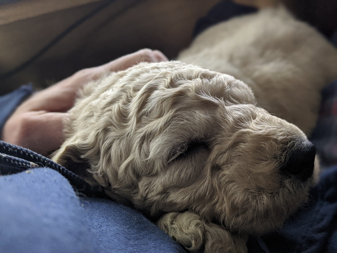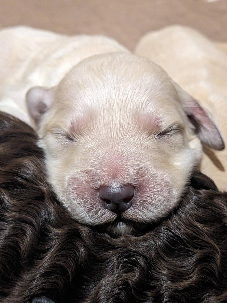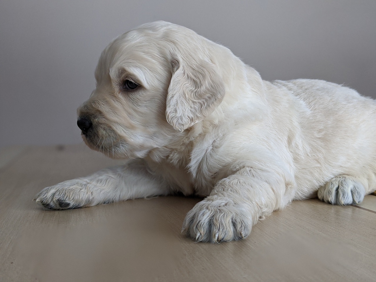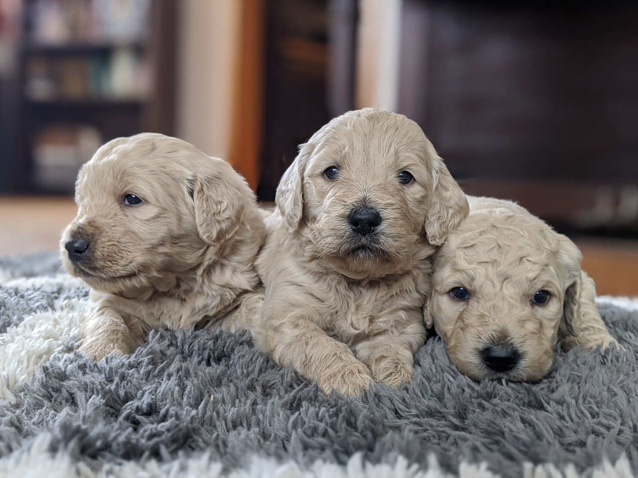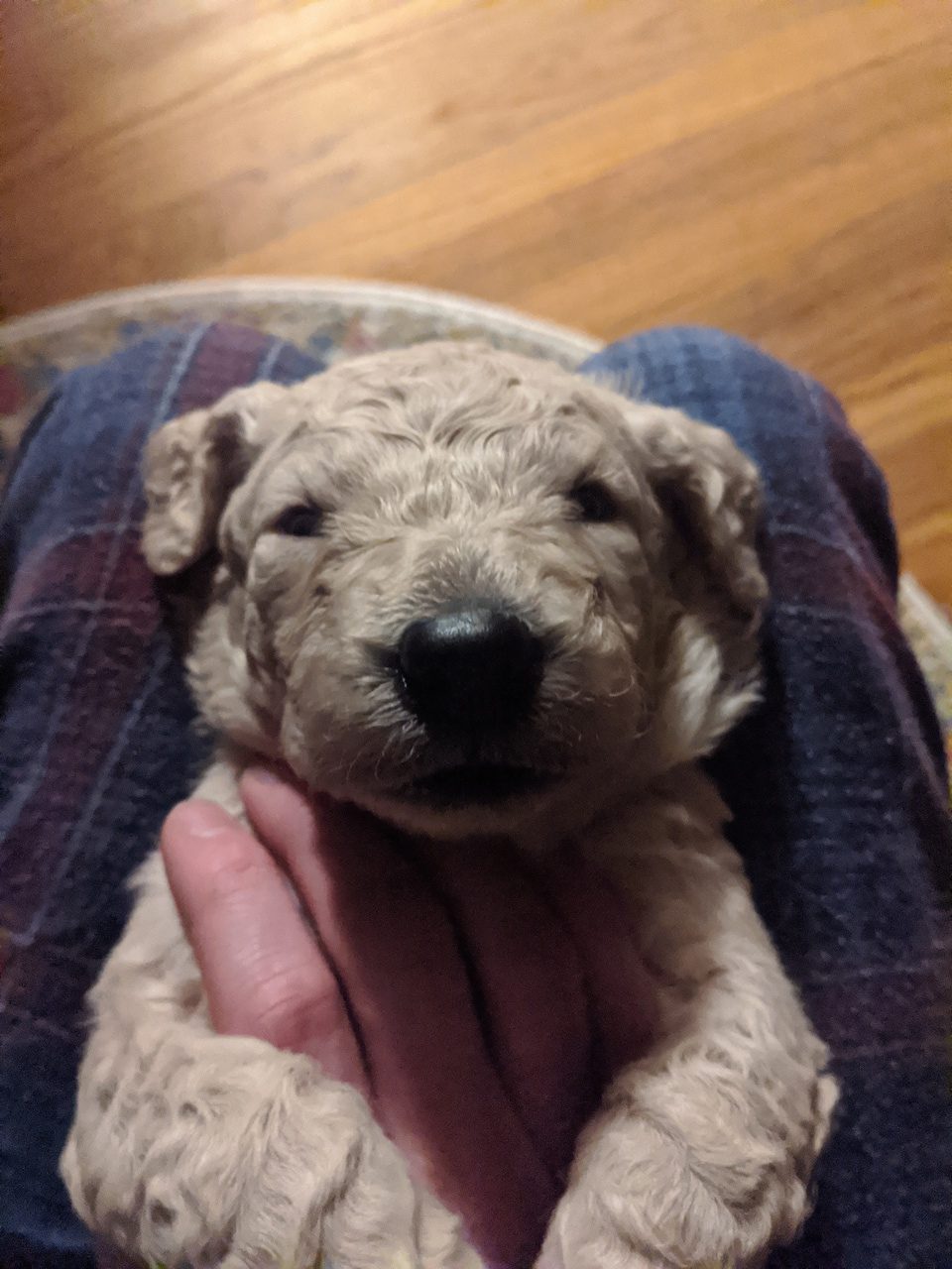 Update 2/21/2021: We have one puppy still available for adoption: a very sweet, curly male. Here’s a video of him in action. Feel free to reach out to us on the contact page for more information! We have puppies! Our English Cream Golden Retriever “Pyrrha” gave birth to a litter of six beautiful Golden Doodle puppies on January 6th, 2021! They’ve been growing like crazy ever since!