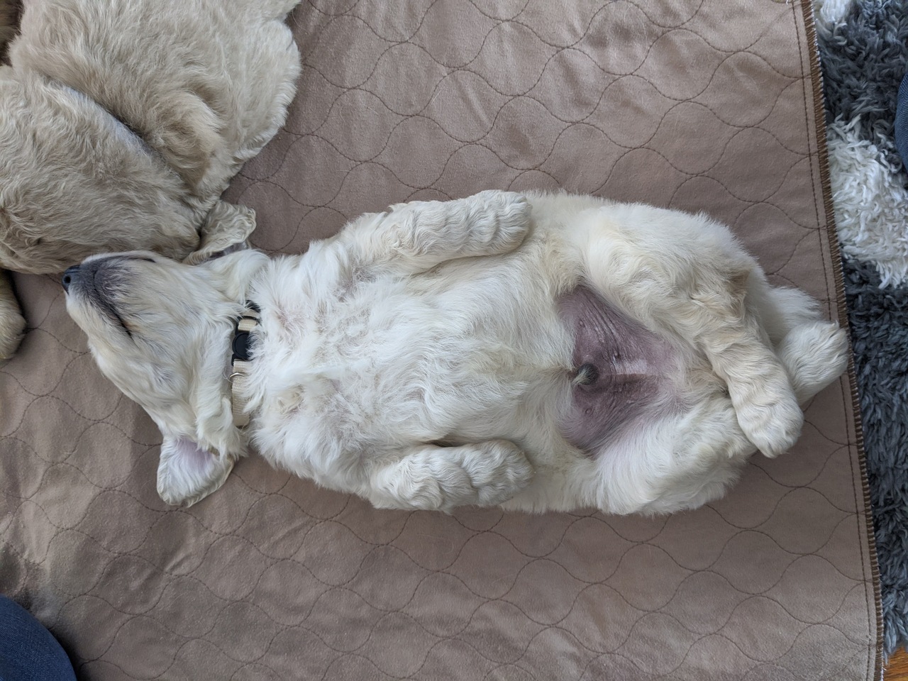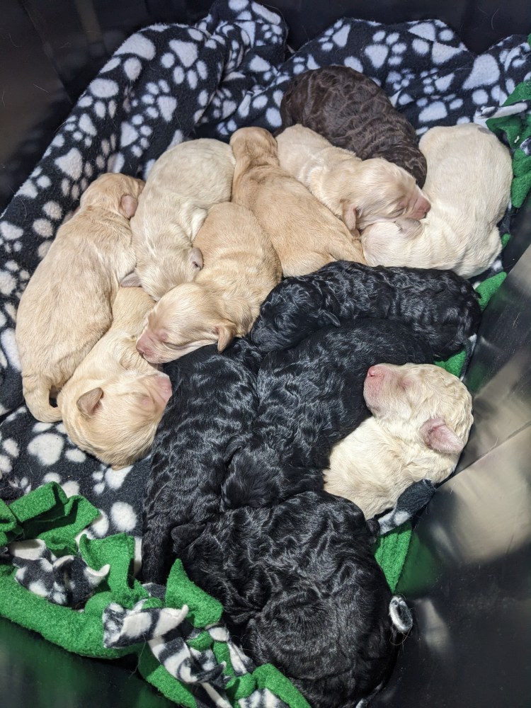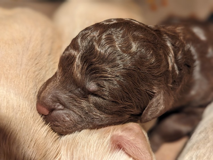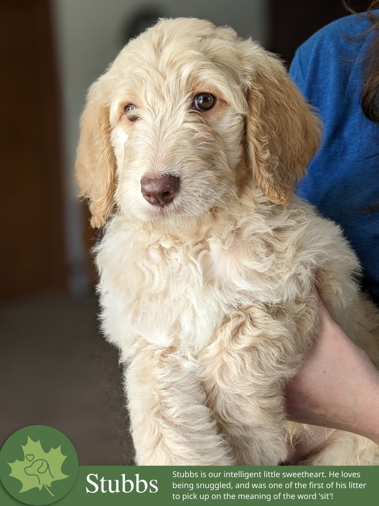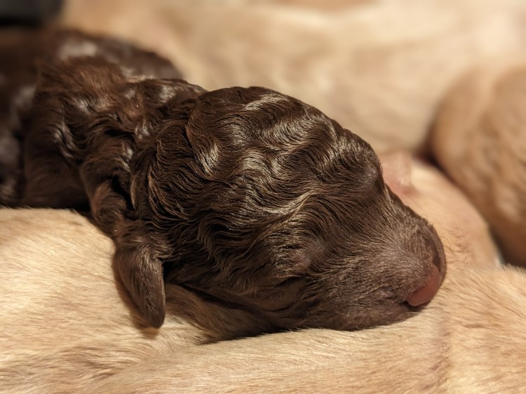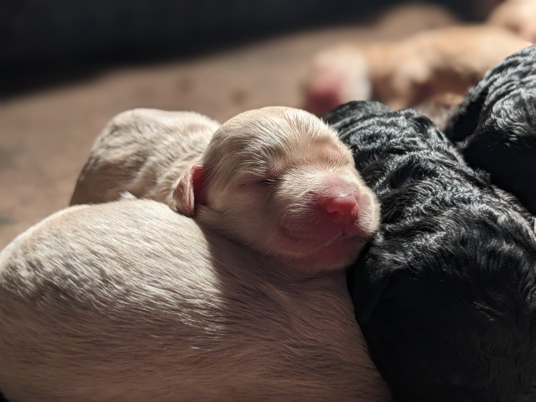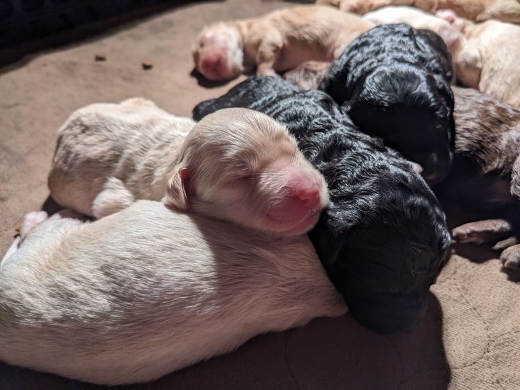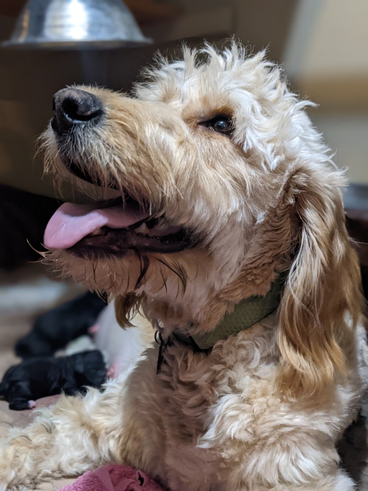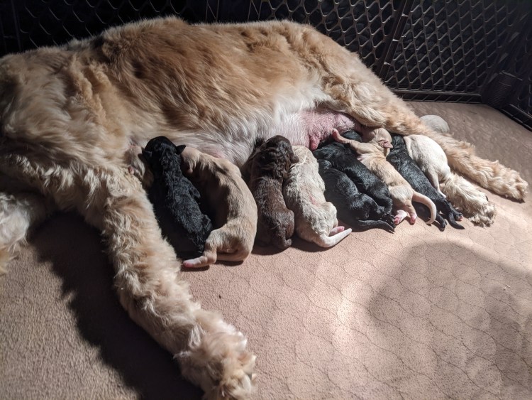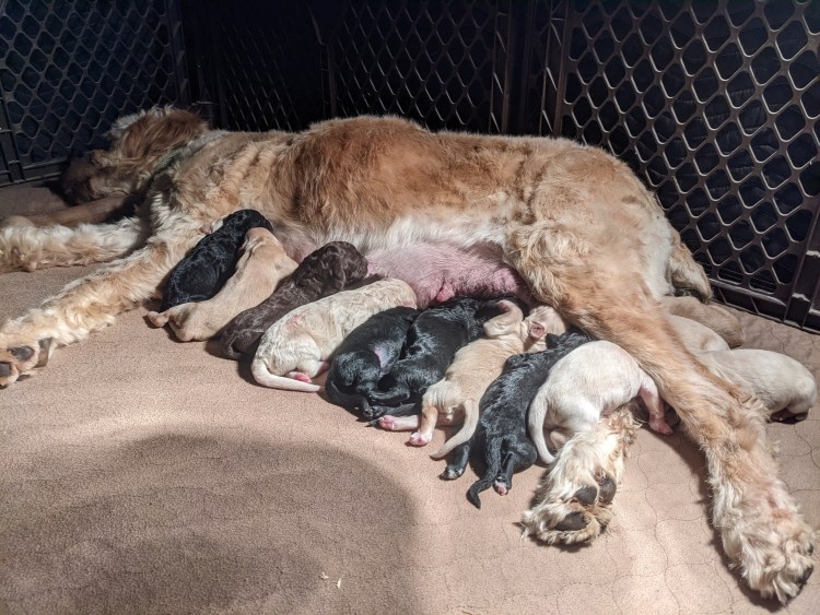 12/07/2022: After ages of feeling very pregnant, our Golden Doodle “Penny” has given birth to a happy and healthy litter of puppies! Please feel free to follow us on our Maple Peak Puppies Facebook Page for regular photos and updates on our newest little ones.