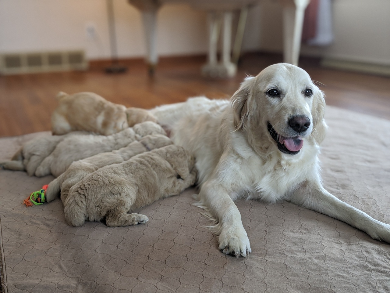 9/3/2021: Our female Golden Retriever, Pyrrha, gave birth to a healthy litter of nine puppies on September 3rd! If you are interested in adopting one of her little ones or want more information, please drop us a line via email or give us a call. Our contact info can be found on the contact us page. Thank you!